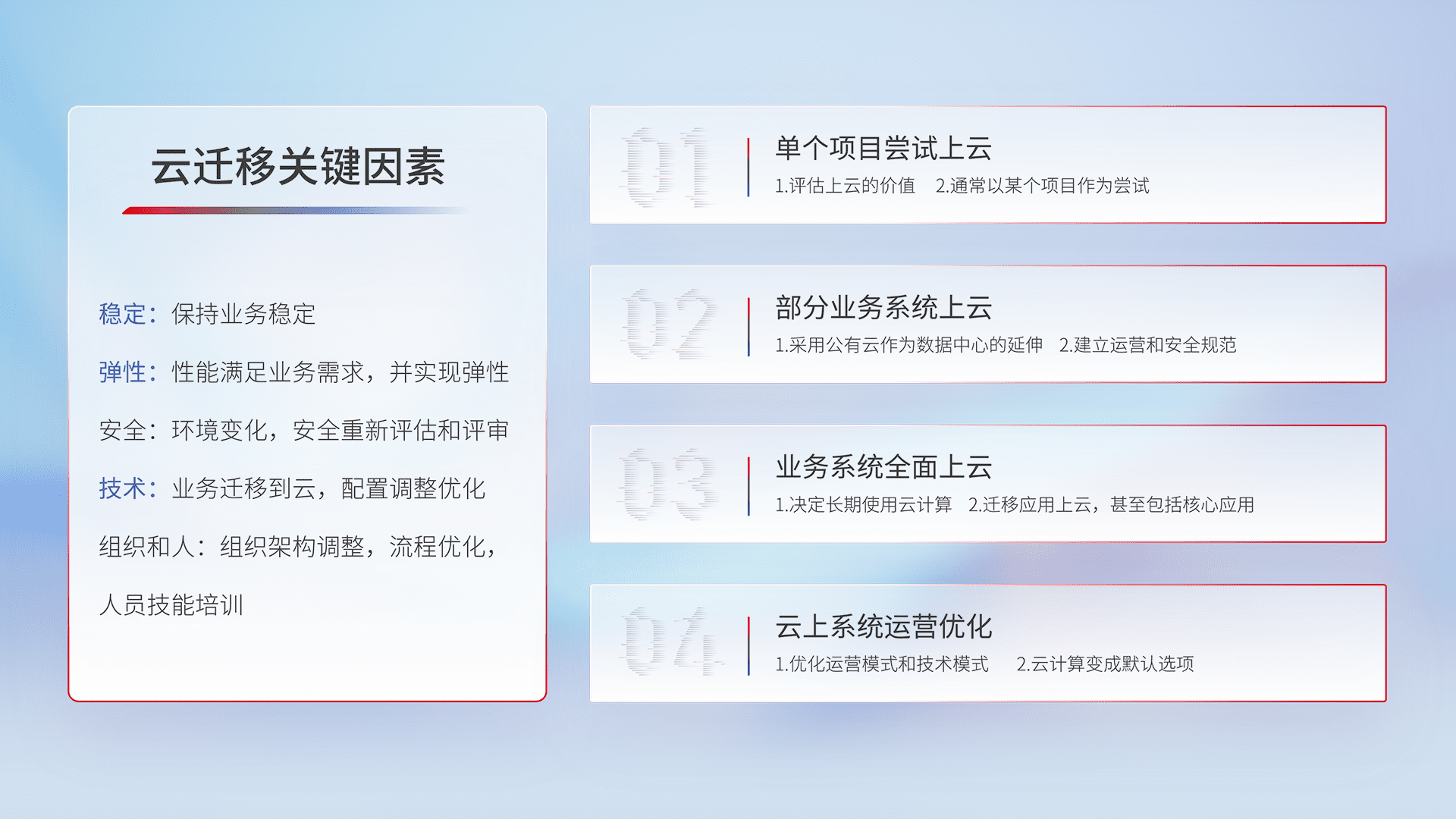 结合实际业务,,,从规划设计、、、云平台选型、、、、云原生改造、、数据迁移、、集成交付,,,,迁移全过程为客户识别最佳上云路径,,,做好风险识别管理,,,,设计网络架构、、、身份权限、、、、安全审计合规、、、操作审计、、、日志审计、、、监控告警策略、、、多站点容灾设计等,,,,对云上基础设施进行整体规划,,,提升IT治理水平,,,以满足弹性、、高可用、、高性能的需求。。。