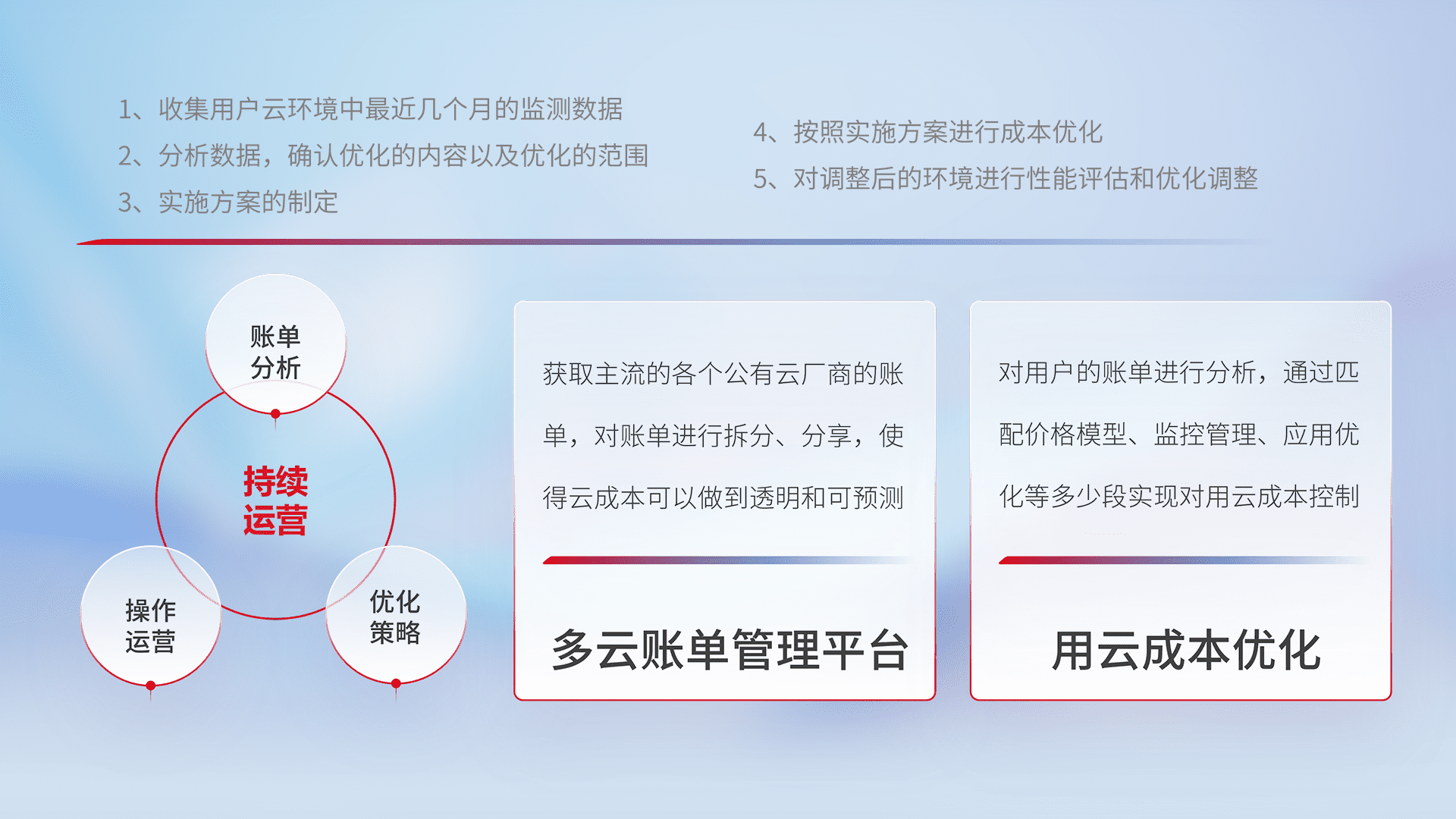 通过多云纳管,,,,以统一的资源数据模型把客户的云资源进行抽象和封装,,,,进而实现对多云资源的统一操作,,保障云资源管理的可靠性、、、、稳定性与可用性。。。量身定制化运维内容,,配置、、、开发运维、、、补丁管理、、备份、、、监控、、、、认证和访问管理、、、审计和日常巡检等,,,保障在用云过程中的可靠度,,,稳定度以及高可用率。。