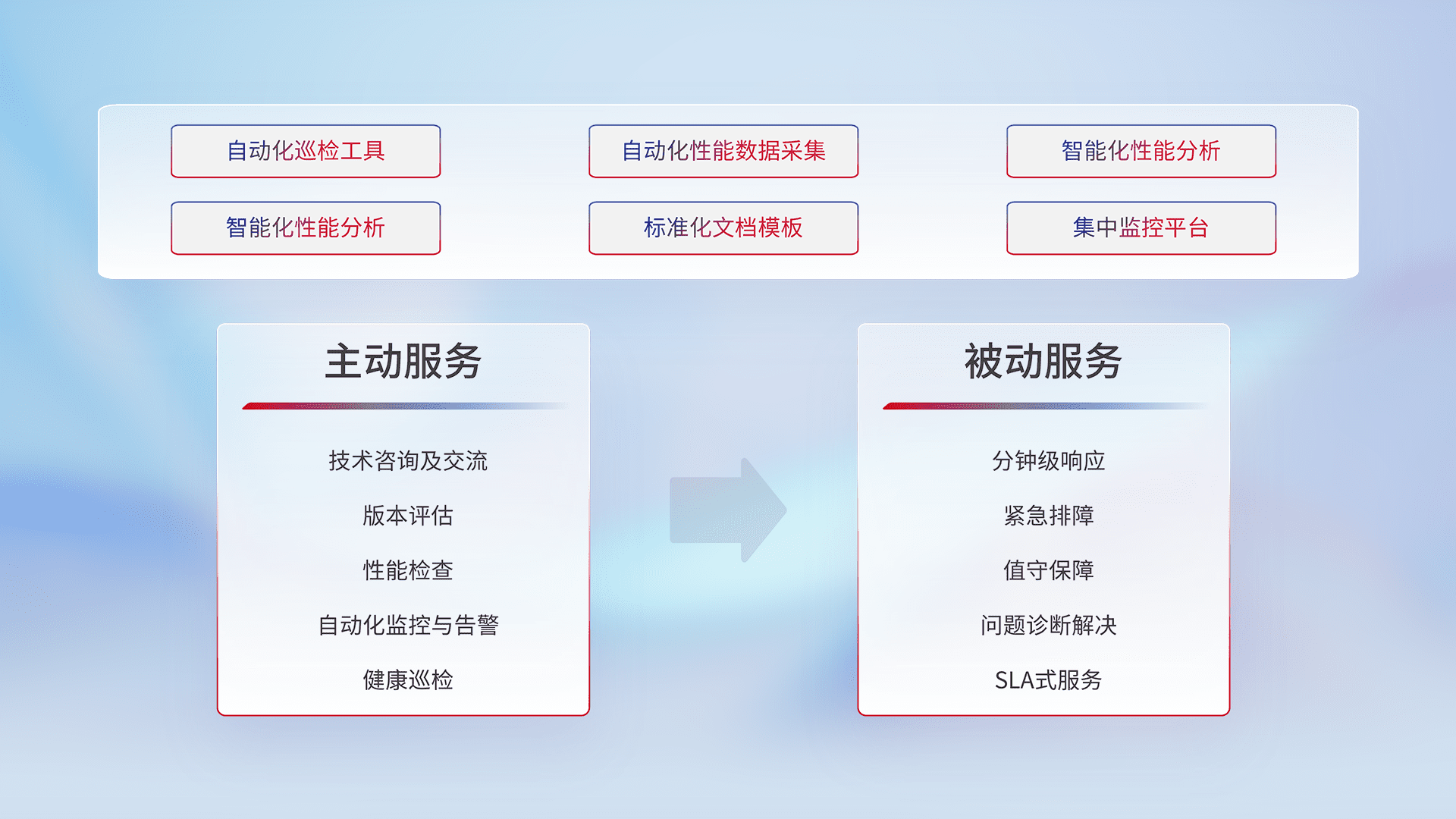 智能化工具和标准化文档,,,保障服务质量,,,提供主动服务(包含技术咨询、、、版本评估、、、性能检查、、、自动化监控与告警、、健康巡检)和被动服务包含(分钟级响应、、、、紧急排障、、、、值守保障、、问题诊断解决、、、SLA服务)。。